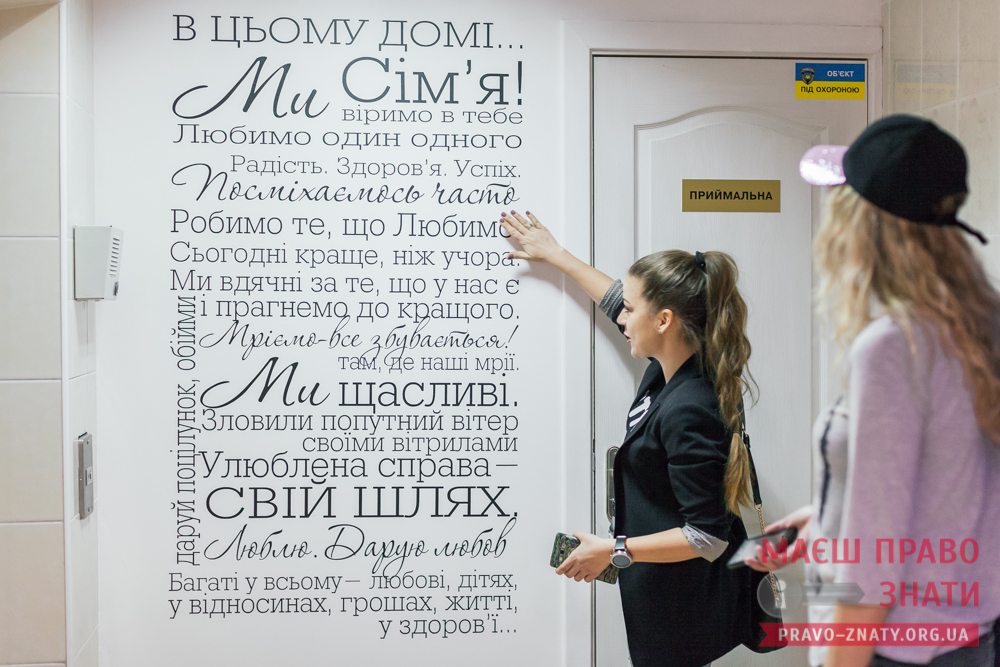 Ця їдея виникла два роки тому, я дуже хотіла її втілити саме на цій стіні. Тут якраз поруч мій кабінет. Текст шукала довго в інтернеті, такий, щоб сподобався всім. Потім було багато роботи: потрібно було кожну літеру клеїти окремо. Ця стіна настільки вразила людей, деякі фотографували.