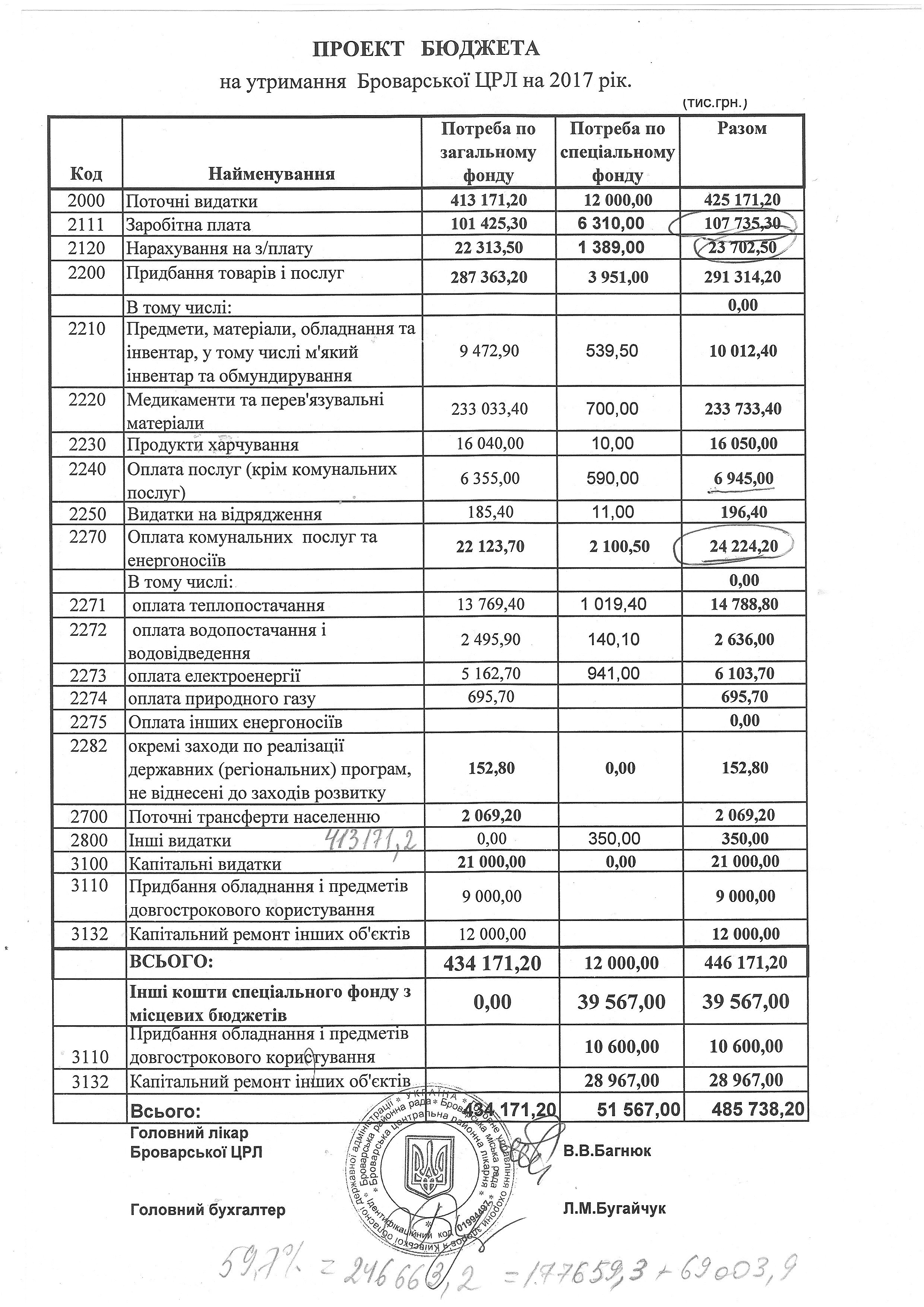 Хоча присутні неодноразово акцентували на тому, що мета зустрічей в рамках бюджетних слухань - стратегічне планування, що цифри геть приблизні, все одно розглянули проекти, що подали медики. Згідно бюджетного проекту, БЦРЛ заявляє про потребу на 2017 рік по загальному фонду у 434 млн грн (загалом: місто+район, з них на місто - 60%).