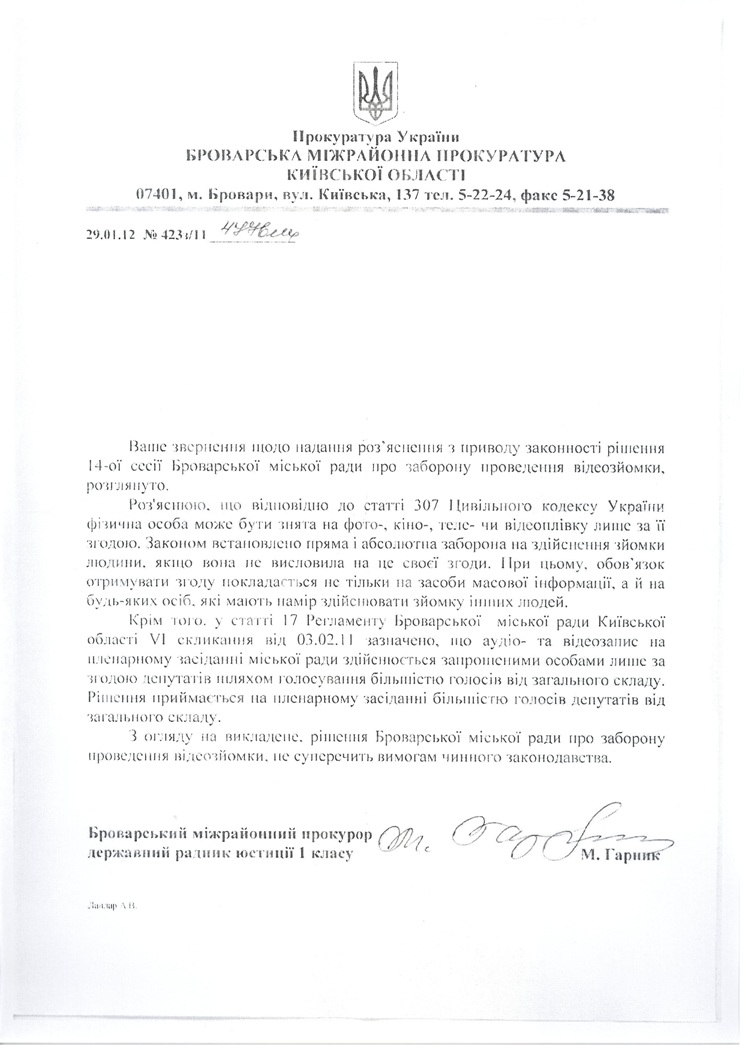 В розпорядження «Маєш Право Знати» потрапив лист Броварського міськрайонного прокурора Миколи Гарника, в якому той стверджує, що рішення місцевих депутатів про заборону зйомок сесій – законне.