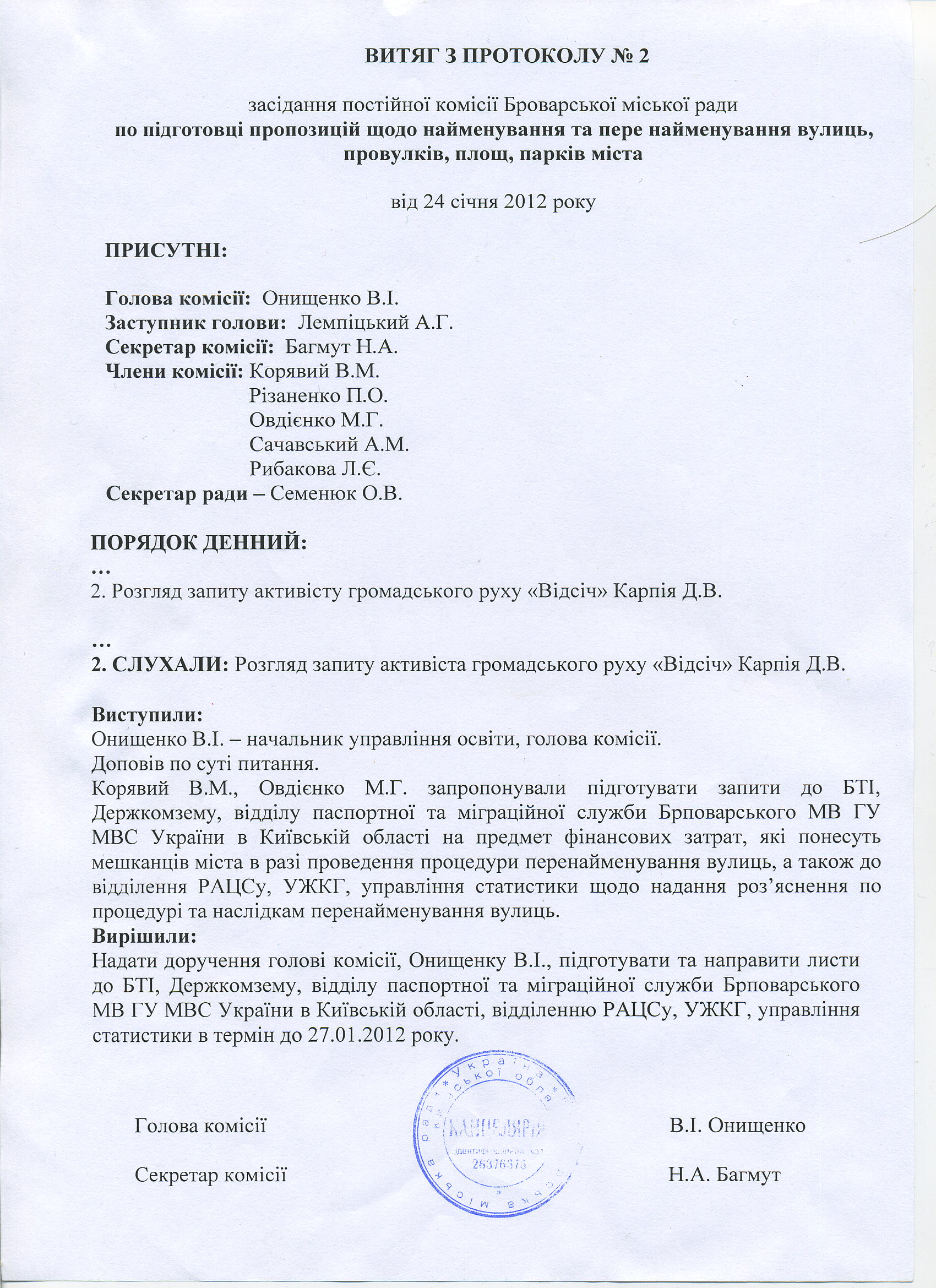 З протоколу №2 засідання комісії видно, що голові доручено надіслати листи до служб, які причетні до заміни документів, пов’язаних з перейменуванням вулиць.