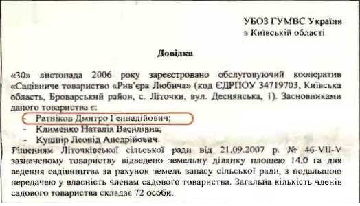 Регіонал Ратніков заперечує свій зв’язок з даною «махіною» вже не перший рік, в той час як документи свідчать про зворотнє. Засновником Садівничого товариства «Рів’єра Любича» є сам Дмитро Геннадійович, його мати та ще один родич. Подібна інформація публікували й раніше, і тоді Ратніков її категорично заперечував, натомість не продемонструвавши жодного документального доказу своєї правоти.