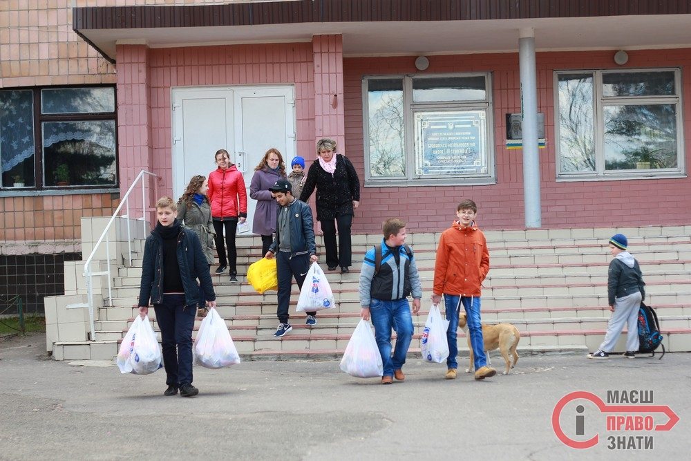 До автівок всідаються старші школярі (8-10 класи), один малий з 3-го класу і Вікторія Володимирівна. Авто, навантажені подарунками (продуктами, ліками, памперсами) вирушають у гості до дітлахів.